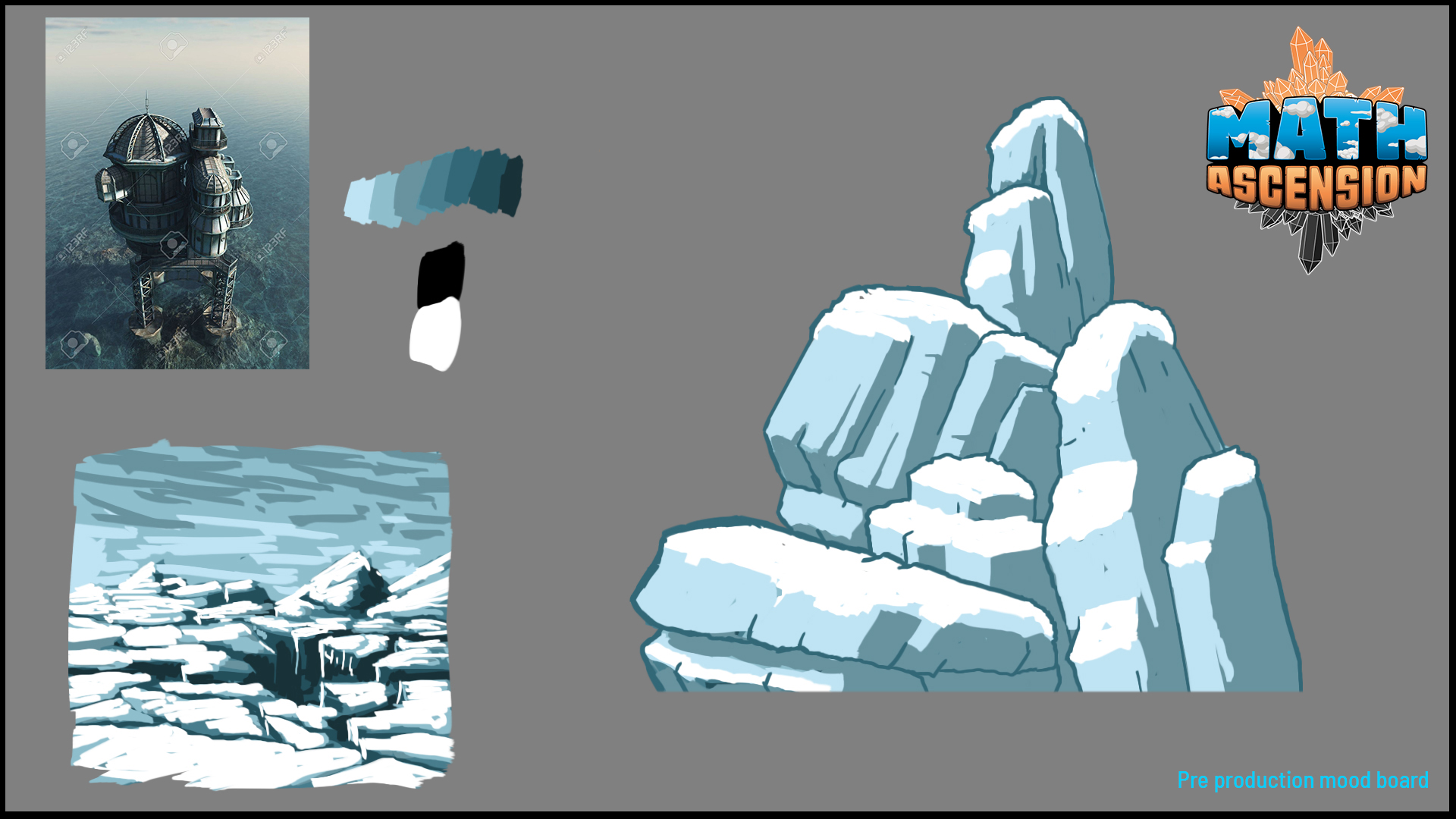 Different example of creative process and atmosphere research that were used to establish the graphic line of "Math Ascension" by Pestorosso Games at the beginning of the project (2022)